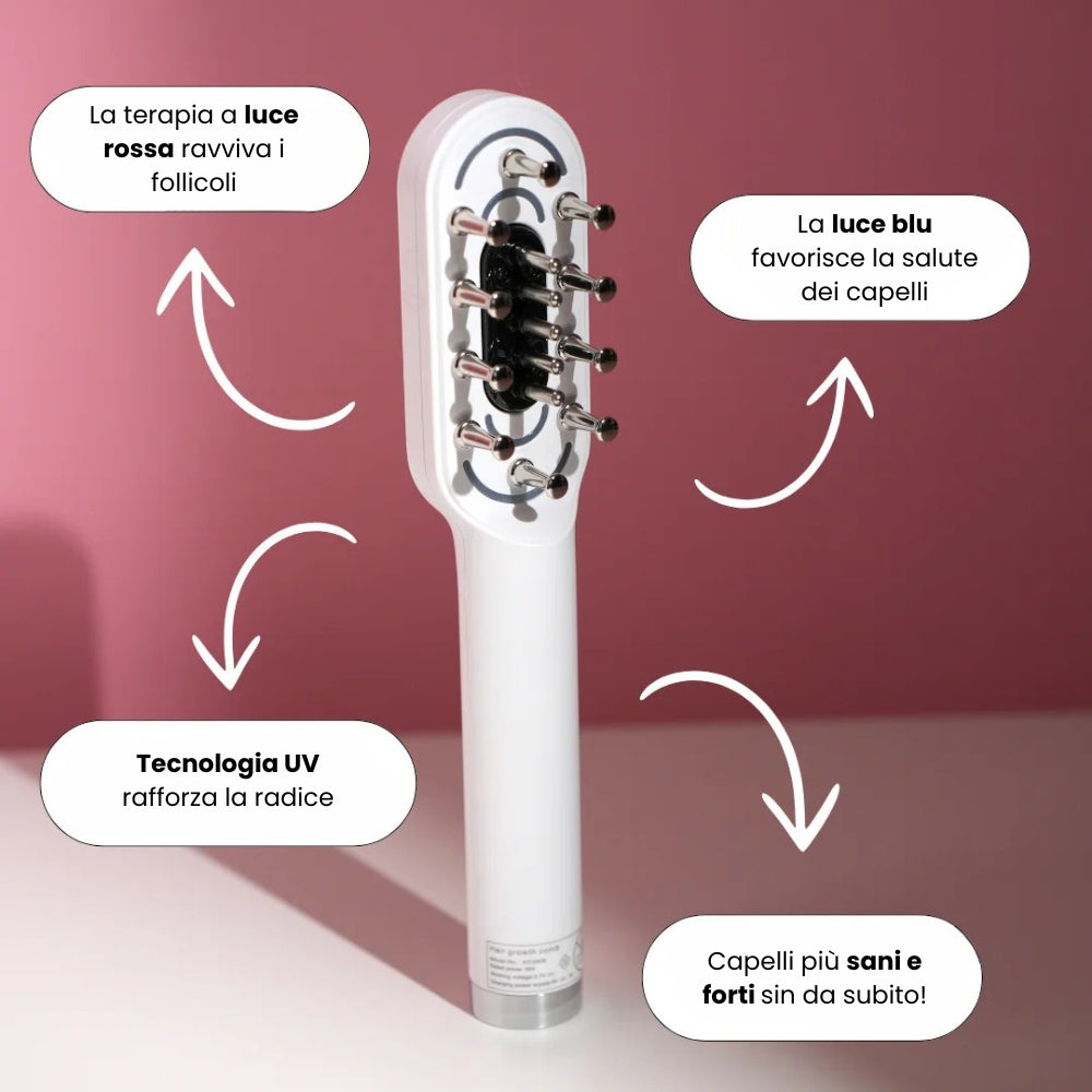 La spazzola UV combina la luce blu per purificare il cuoio capelluto e la luce rossa per stimolare la crescita dei capelli.